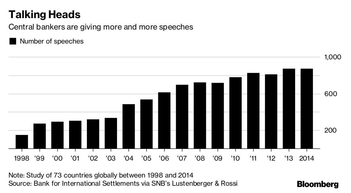 Centrale banken hebben het er de laatste jaren maar druk mee. Zo is het aantal toespraken dat ze jaarlijks geven in de periode van 1998 tot 2014 verzesvoudigd. Sinds de financiële crisis communiceren ze niet alleen over hun monetaire beleid, maar proberen ze de markt ook met woorden in een bepaalde richting te sturen. Denk aan centraal bankiers die zeggen dat ze de rente nog lang laag zullen houden of dat ze zullen ingrijpen, mocht dat ooit weer nodig zijn. ‘Forward guidance’ noemen we dat.