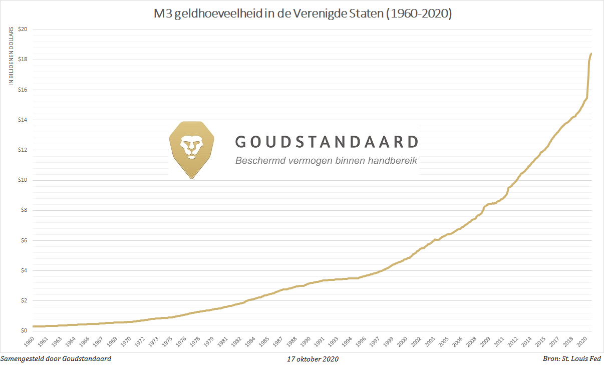 Als we met deze kennis naar de huidige economische situatie kijken, dan ziet het er allemaal niet best uit. Sinds de uitbraak van het coronavirus hebben centrale banken de spreekwoordelijke geldkraan wagenwijd opengezet. Hieronder ziet u de ontwikkeling van de geldhoeveelheid in de Verenigde Staten over de afgelopen zestig jaar. Helemaal rechts ziet u het effect van de coronacrisis. De geldhoeveelheid neemt nu bijna exponentieel toe.