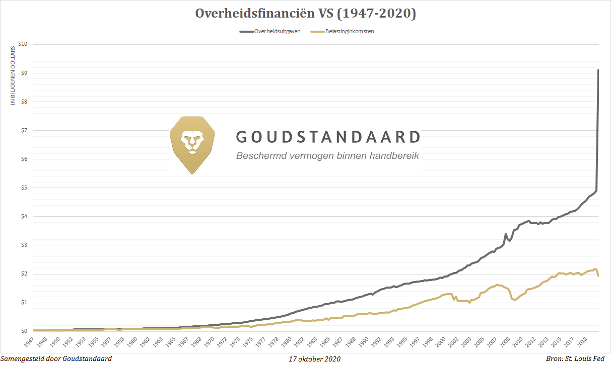 Dat betekent dat overheden zich nog dieper in de schulden steken om de economie draaiende te houden. Hieronder ziet u de impact van de coronacrisis op overheidsfinanciën van de Verenigde Staten. Terwijl de overheidsuitgaven exploderen nemen de belastinginkomsten door lockdown maatregelen juist af.