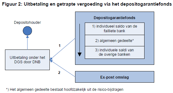 Valt een bank om, dan moeten alle spaarders gecompenseerd worden uit het garantiefonds. Indien dat bedrag groter dan wat het garantiefonds in kas heeft, dan moeten overige banken in één keer maximaal 5% van hun eigen vermogen neerleggen. Maar als de Nederlandsche Bank van mening is dat daarmee de financiële stabiliteit in gevaar komt zal die het maximum verlagen.